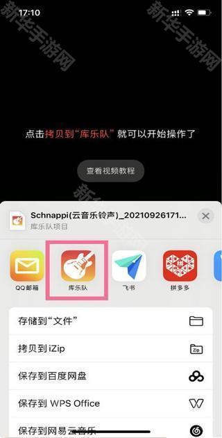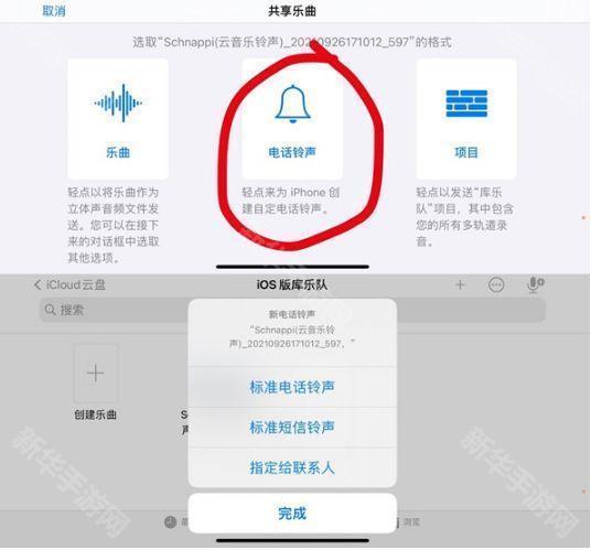 2、在弹框提示中,点击“来电铃声”;在底部出现的窗口中,点击“库乐队”,歌曲铃声就可以导入到库乐队中,并且会自动打开库乐队软件。