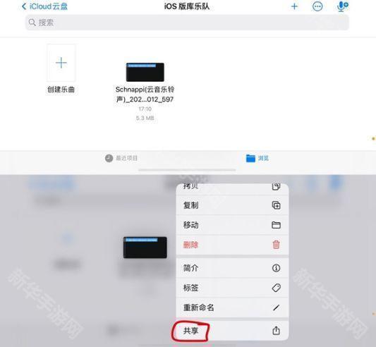 3、在库乐队中长按音乐,在跳出来的对话框中选择【共享】。