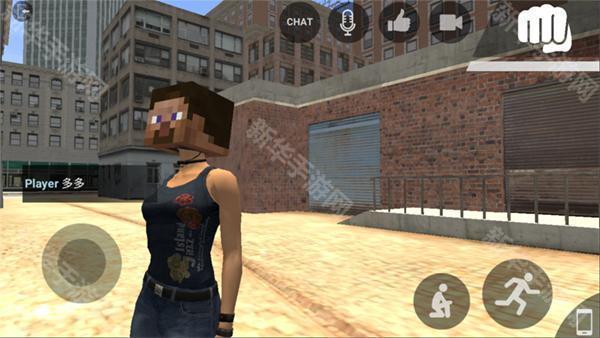 4、进入游戏里,可以先点击【chat】对话,左边的圆圈是前进或者后退,右边则是蹲下和跳跃