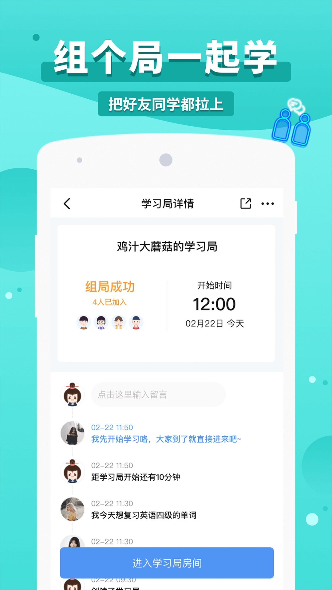 制定学习您的学习科目,通过专业的大数据分析来修正您的学习状态和目标管理,巧妙的过场设计和数据总结,让您的学习过程不再孤独,充满生机。在这里面找到属于你的学习节奏,结识更多的学习伙伴,与优秀的人结伴同行一起学习吧!