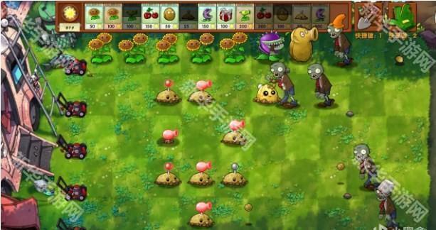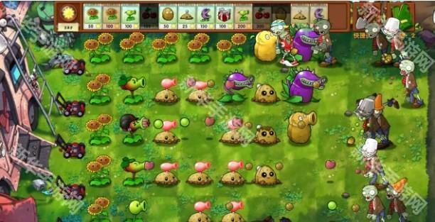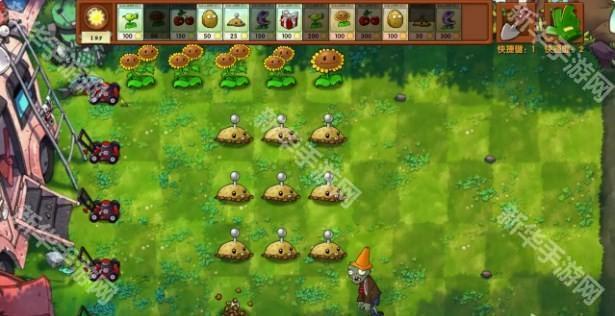 2、使用高于向日葵高度的坚果保护一路,其他路可以都种上“豌豆土豆雷”和“豌豆坚果墙”。