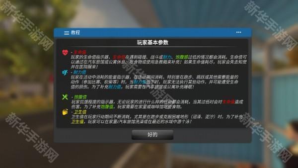 1、进入游戏前,先看一下玩家扮演司机时的基本参数:生命值、耐力值、饱腹值,卫生值