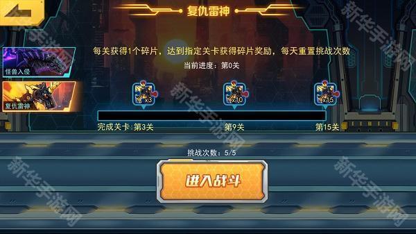 ◆ 复仇雷神:每关获得1个碎片,达到指定关卡获得碎片奖励,每天重置挑战次数。