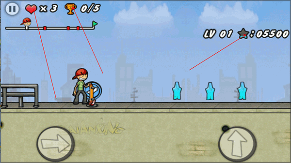 1、下载安装好滑板小子,进入游戏,左边的方向键可以控制速度,右边的可以控制跳跃。