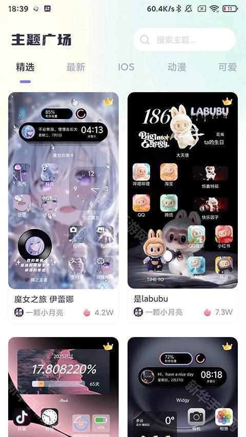 4、主题:主题广场包含了最新、热门、iOS、动漫、可爱的手机主题;