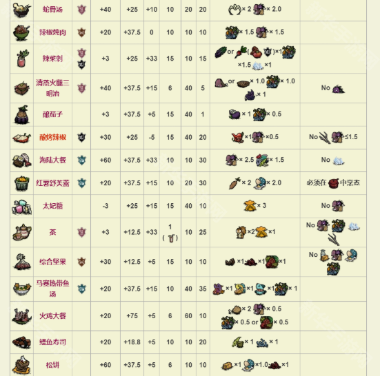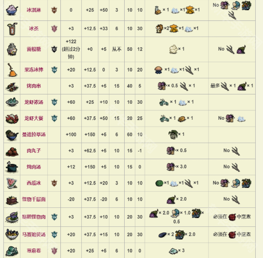 1、从第一幅图中,我们可以看到回血最高的分别是曼德拉草汤和火龙果派以及华夫饼。但是曼德拉草汤虽然回血回的多,原料却是太少了。一个地图上能有三个曼德拉草就已经不错了。所以火龙果派是当之无愧的第一,成本低廉,并且吃的时候不会有停顿动作。