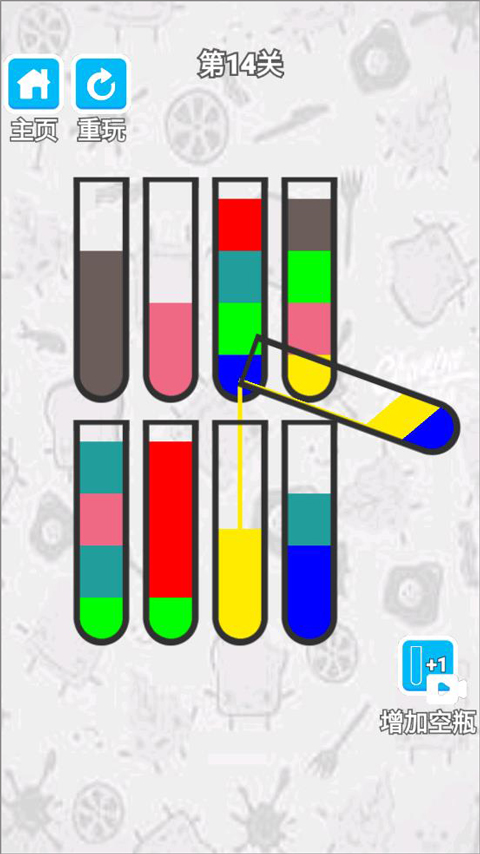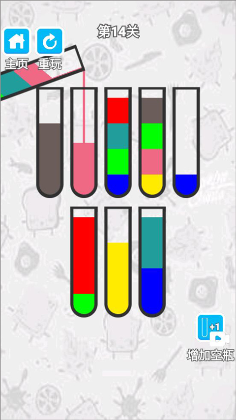 2、玩家点击瓶子将同一颜色的液体放到一个瓶子里;