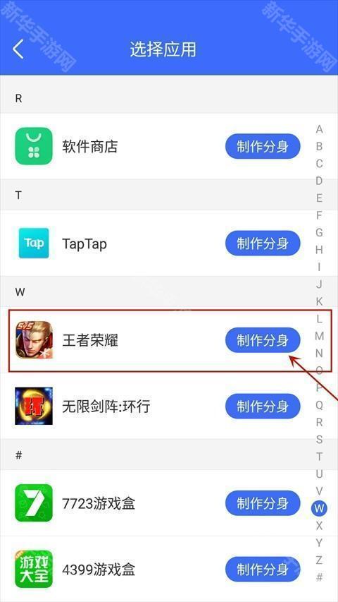 3、找到想要分身的应用,由于我们需要分身的是王者荣耀,所以我们找到王者荣耀点击制作分身。
