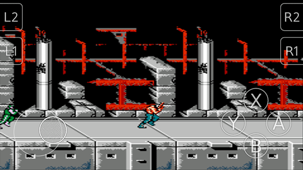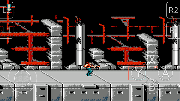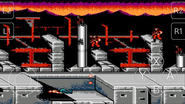 1、可在横版场景中上下左右移动,按A键跳跃,B键射击,支持8方向瞄准。