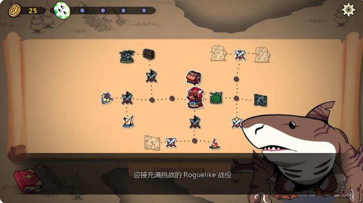 第三张图——同上,打几场耗残一个配角后再去神龛替换,画作奇美拉也可以考虑一下阵容需求,此时的格子数一般是443或533,几乎已经成型了,就看随机的装备是否搭配的了;阵容凑齐去篝火可以选择用餐或缝包了;不追求金币分数的话,钱都花了
