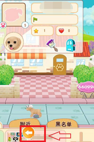 4、此时在狗栏这会揭显出一个白箭,按这里方可进到此友的舍堂了,于此里面的狗狗也会迎来。