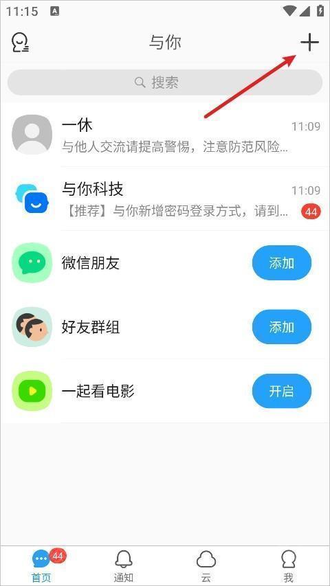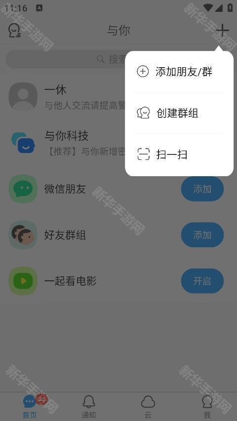 2、在下拉菜单里点击“添加朋友/群”的选项