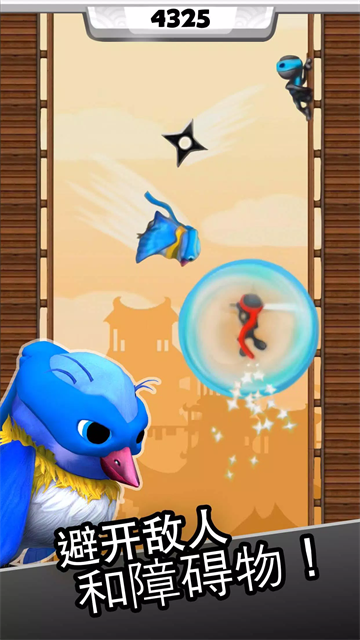 忍者跳跃是一款休闲动作类游戏,玩家将会操作一位忍者来到墙壁上不断跑酷,游戏的操作极其简单,玩家只需点击一下屏幕即可,点击屏幕以后,忍者就会跳跃到另外一边墙壁,在跳跃的过程当中还会发动旋转斩击,能够将路途中的动物以及子弹给斩掉,在连续将三个相同的动物以及子弹给斩掉时,玩家就可以触发冲刺技能,能够直接获得几百点积分,快来下载体验一下吧。