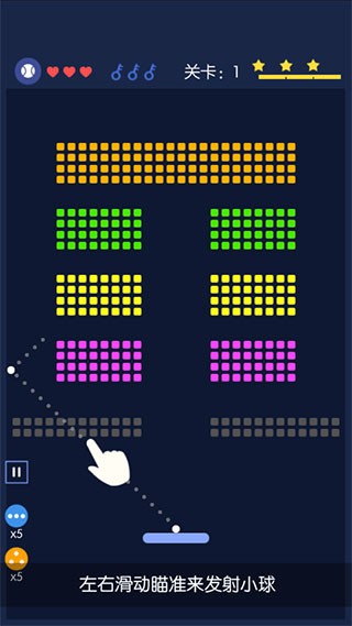 3、操作简单,只需通过控制滑板来反弹小球,使小球撞击并消除砖块即可。