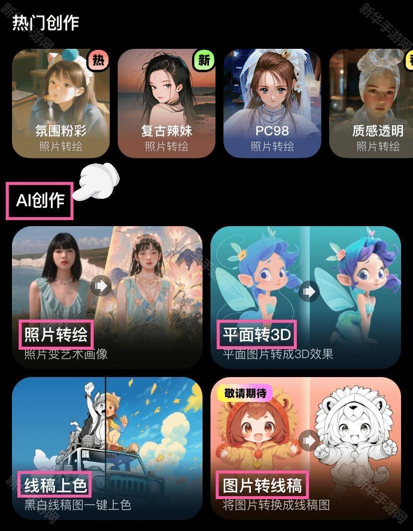 找到【AI创作】区域,可选择照片转绘/平面转3D/线稿上色等各种有趣的创作功能哦~
