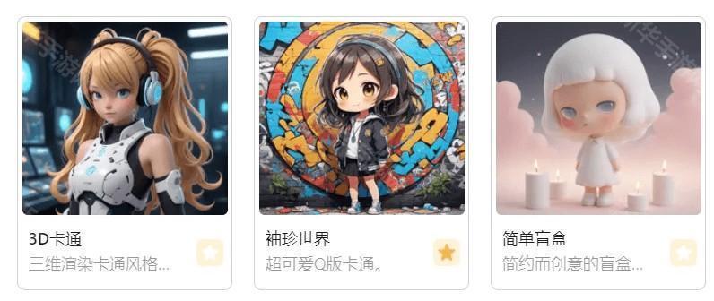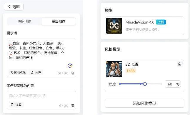 · 当然也可以进入高级创作使用风格模型LoRA,比如官方的{3D卡通}{袖珍世界}{简单盲盒}LoRA,都可以帮你生成风格化的盲盒呦!