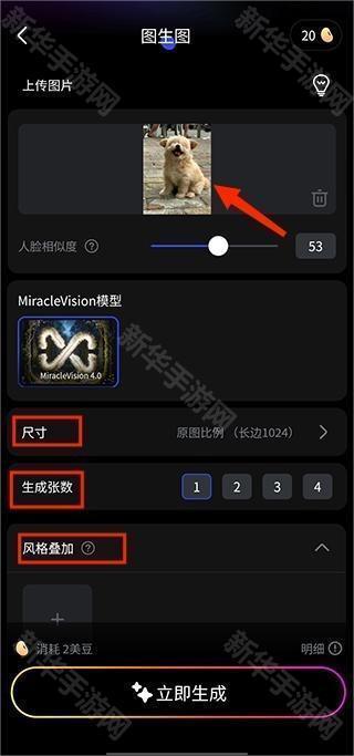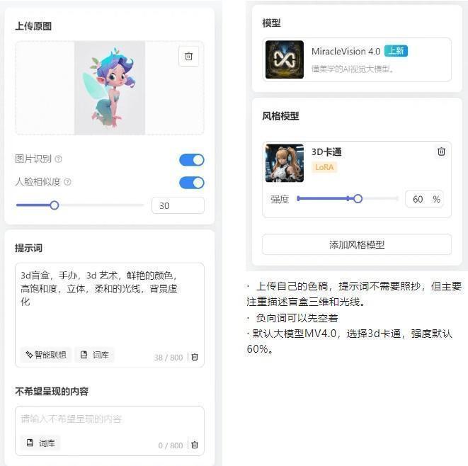2、进入后点击上传图片然后选择图片相关选择,如人脸相似度、风格叠加还有对于画面风格的要求的提示词;