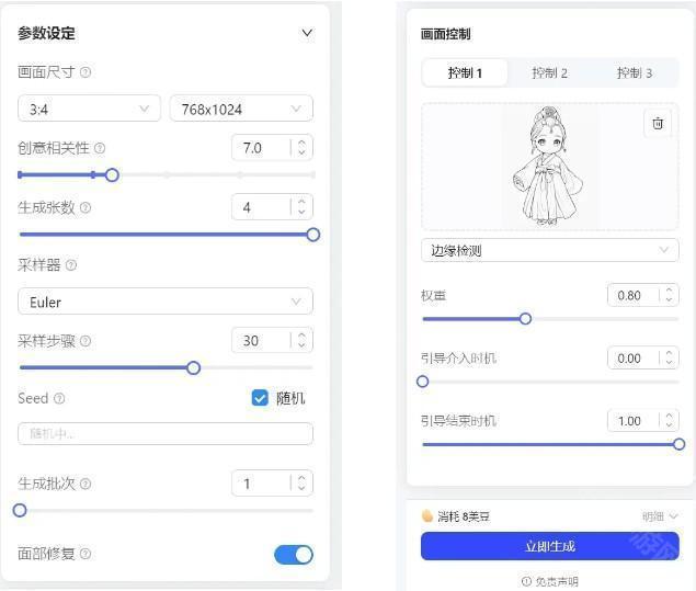 · 画面控制需要上传无色线稿,权重开到0.8,模型选择边缘检测,点击生成!切记线稿线不要太粗!