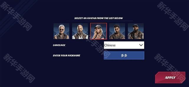 1、点击运行游戏后,在这里的Language中选择Chinese、输入你想在游戏中展现的昵称后选择并点击“APPLY”的按钮选项;