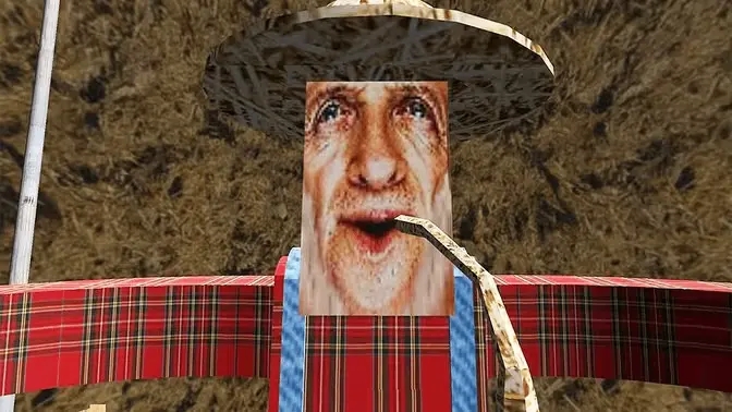 结局三:当你逃到屋外,此时的农场已经布满迷雾,这时农夫会开着拖拉机来抓你,而你要收集5个瓶子,完成后你就会被老太太绑在凳子上,最后四面八方挖掘机里腌萝卜会把你包围,然后你就会被燃成灰烬。