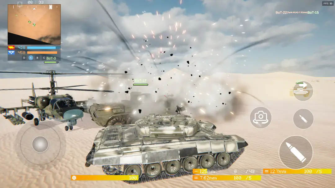游戏的场地非常大,玩家可以选择驾驶装甲车、坦克和直升机等等,同时还有7种不同的武器可以选择,在面对敌人的时候,需要避开他们的子弹,才能更好的瞄准敌人将其击落。