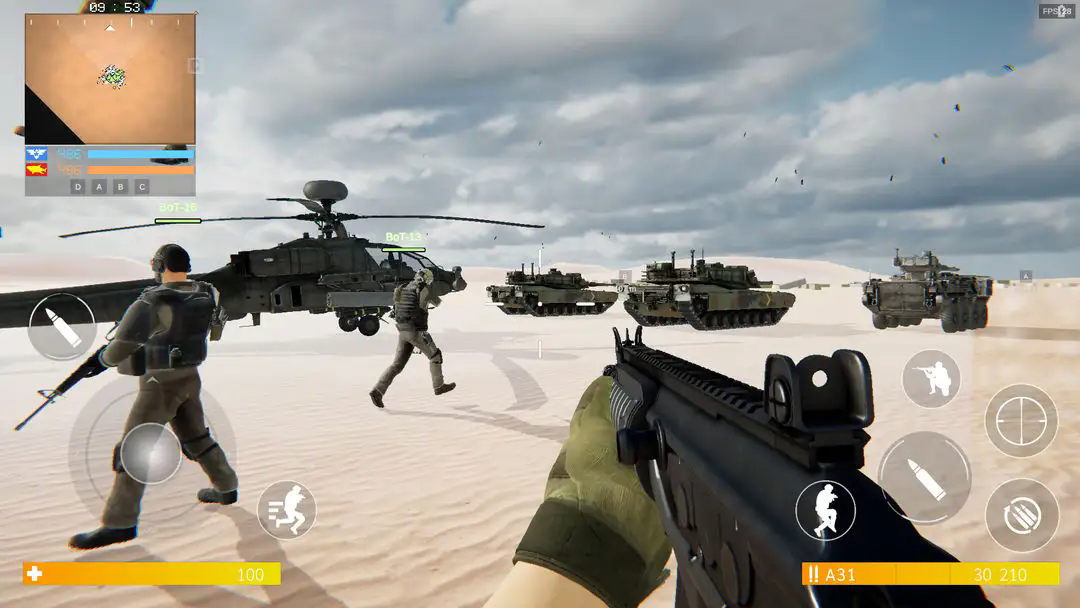 【装甲枪战】这是一款射击动作类型的游戏,游戏由“越越工作室”出品,这款游戏让玩家体验枪战和空战的乐趣,超大地图等待着你的探索,玩家可以在游戏中使用冲锋枪、手枪和机枪等不同的武器,并且驾驶直升机和坦克等等载具武器,和最多60个AI共同挑战,无论是操作还是射击,手改都非常的逼真,还原最真实的战场,给你极致现代战争的体验,而且不联网即可游玩,快来试试看吧。