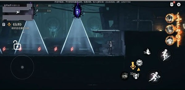 1.游戏采用横版动作玩法,玩家通过横版跳跃、冲刺攻击、角色技能及奥义技能等方式进行战斗。
