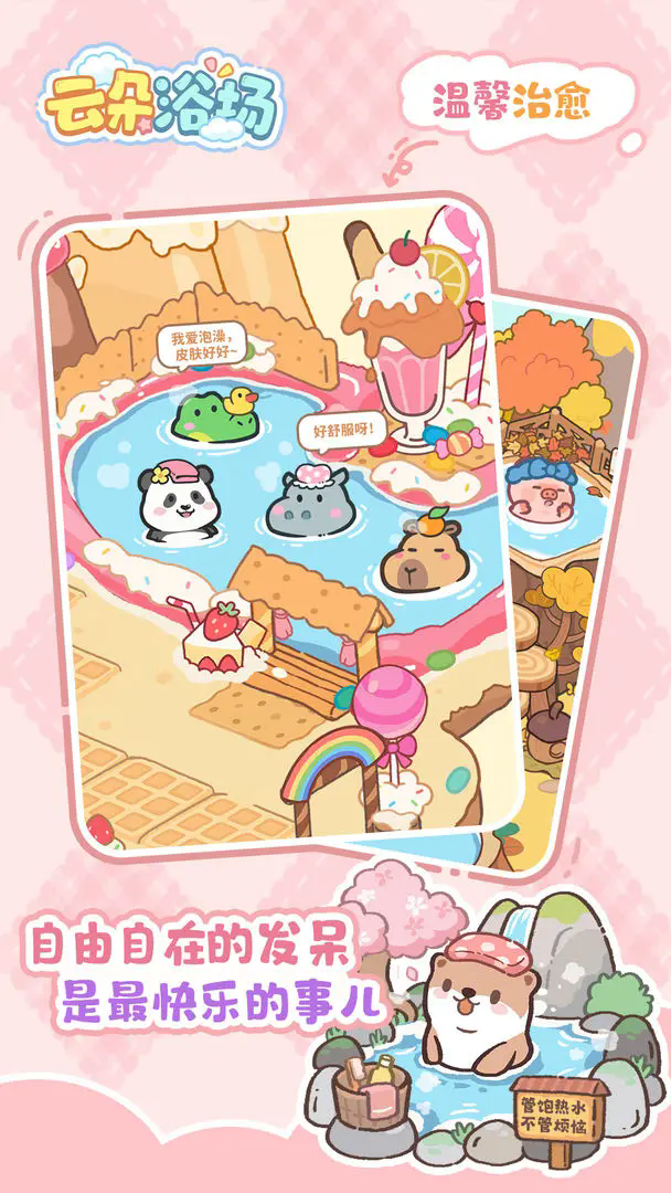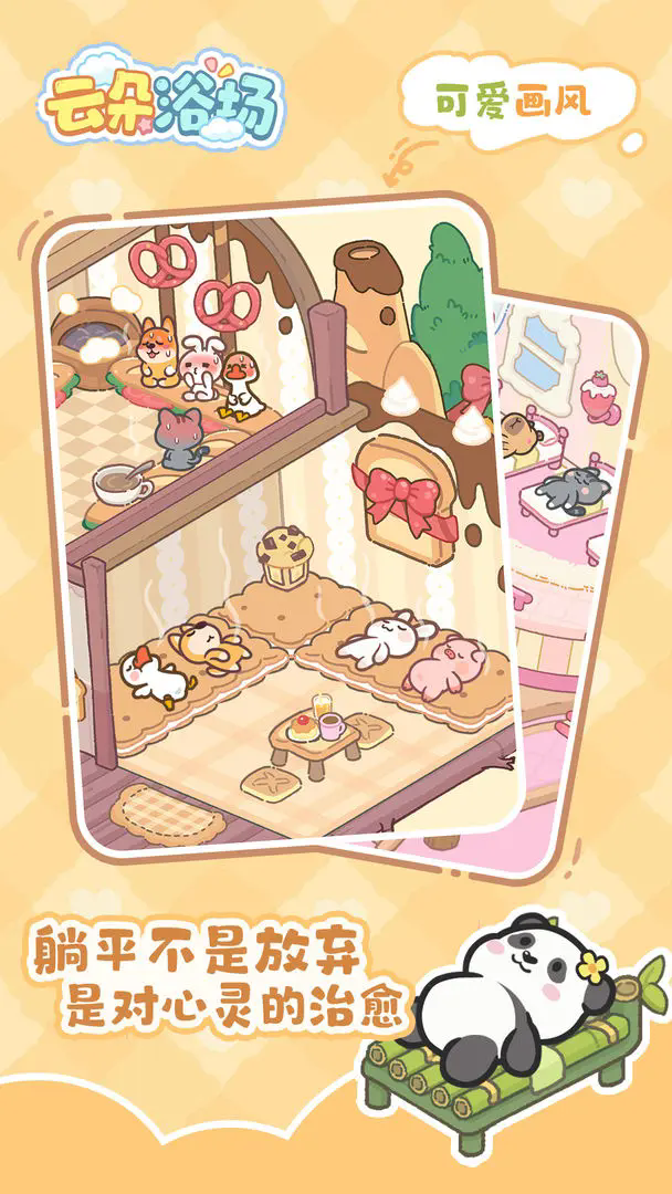云朵浴场是一款卡通画风的模拟经营类型的游戏,在这款游戏之中以可爱卡通风格为玩家打造出了一个可爱的浴场,玩家要做的就是经营这一家浴场为每一位可爱的动物顾客提供服务,用你的帮助来让来到这里的所有小动物都能缓解疲劳,获得轻松和治愈。这款游戏中还有着很多不同的游戏玩法和趣味可能性,不同的顾客能解锁出不同的剧情,对这款游戏感兴趣的玩家就来下载吧。