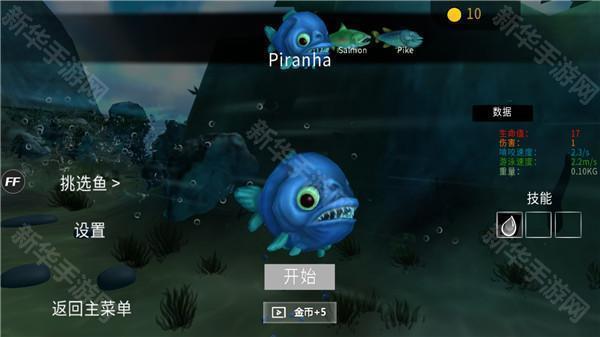 1、选择一条喜欢的鱼进入游戏,前期去吃一些弱小的海星和贝壳发育。