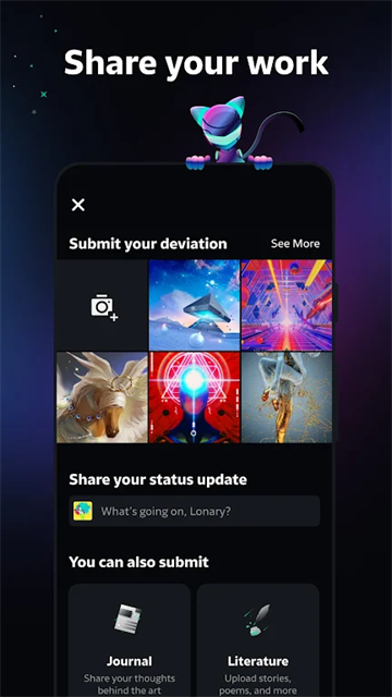 《DeviantArt中文版》里面内置了中文版的汉化内,更加的方便用户进行游玩,用户能够联系喜欢的作者并给他点赞,还有聊天社交分享创作心得,而且这款DeviantArt软件里面还支持AI艺术,能够提升普通人的创作热情,此外,这款DeviantArt里面的商业变现功能也非常有用,包含了在线交易、解散单等实用等功能,还有各种社交互动的功能,感兴趣的用户快来下载这款DeviantArt中文版吧!