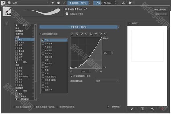3.笔刷的各种属性都可以映射到任意一种或者多种传感器上,进行动态控制。