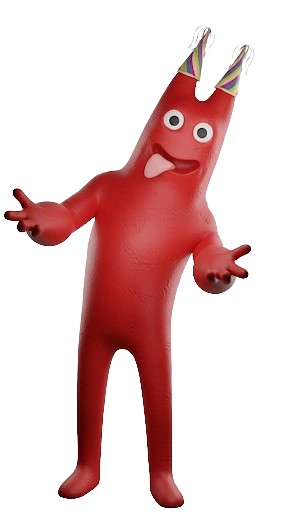 班班是一个高大的红色人形人物,头上的两个角上戴着两顶派对帽。他有两只黑色的圆眼睛和一张没有牙齿的嘴,还有一条松弛的粉红色长舌头。