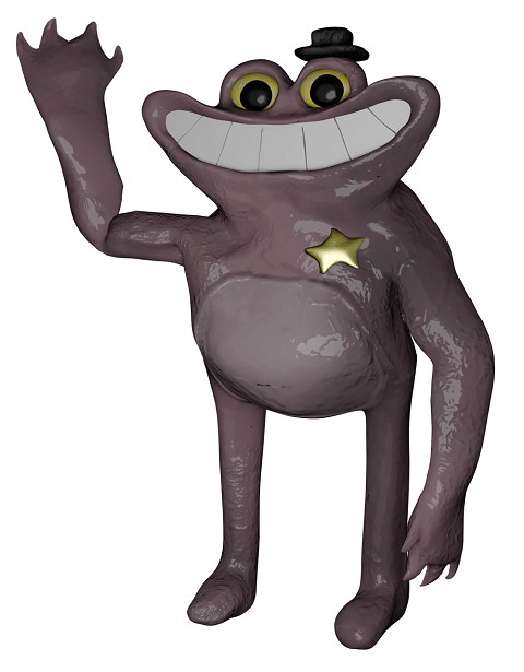 蟾蜍的描绘是一只棕色的大腹蟾蜍,头上戴着一顶微型礼帽,还有一个黄色的星徽。他长着卡通般的微笑,有一排牙齿,身高矮小。