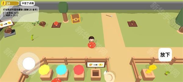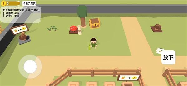 1、进入游戏如图,玩家首先需要根据左上方任务提示,拾取一个红蘑菇到蓝色桌垫上