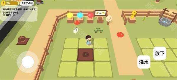 2、其次点击屏幕上的浇水按钮,为刚播下的种子浇水,等待作物成长,期间可以继续进行其余任务,如除虫、除草等。