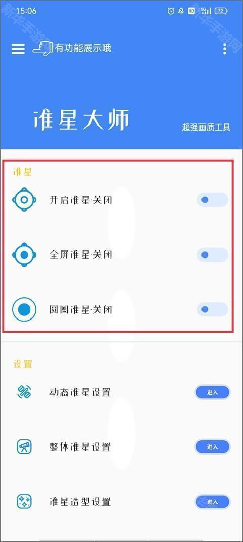 1、在打开准星大师瞄准器App后,默认会进入主页面。第一步是开启准星,你会发现有三种准星供你选择。这意味着你可以根据自己的喜好和需求,在这三种准星中选择一种最适合你的。这个选择将决定你在游戏中使用的准星样式。