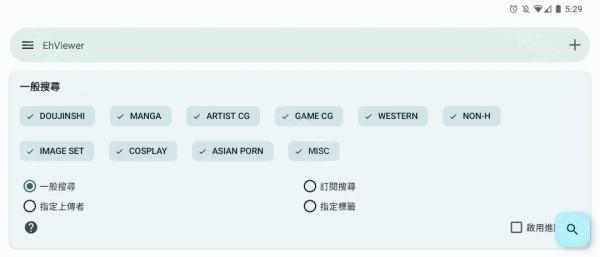 1.点选EhViewer首页的搜寻栏旁边的+号,开启过滤条件,点一下就能过滤掉该分类的结果,例如「Non-H」过滤普遍级内容。