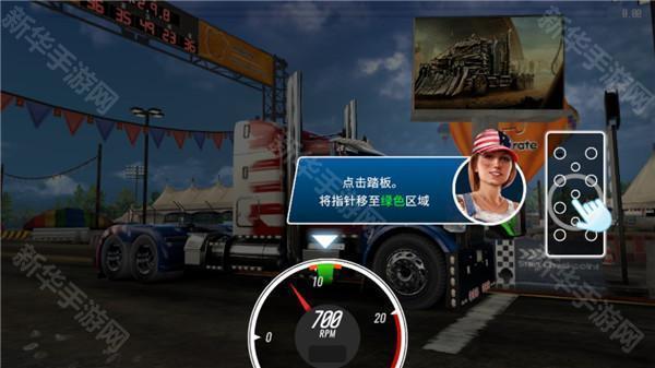 1、打开大卡车竞速模拟器,进入游戏界面,点击右边的踏板,当指针停留在绿色区域就可以起步,
