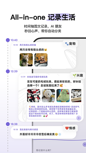 lifelight是一款将ai聊天以及帮助用户轻松记录日常生活日程笔记等内容的多功能软件,这款软件不止可以帮助用户快速记录生活中的某个时刻还可以和ai虚拟角色们进行对话,享受和真人一样的ai分享你生活中的特殊瞬间,ai还会针对你的分享发表评论,这样也能更好的满足用户的分享欲望,总之是一款相当适合充满分享欲的用户的ai软件,感兴趣的话就来本站下载吧。