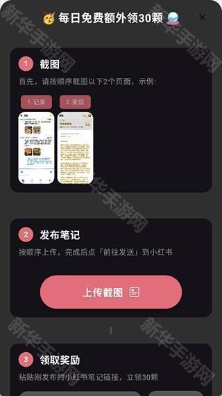 3、接着就可以通过官方给出的方式领取免费使用app的奖励,这里主要就是通过截图且发布到小红书上即可领取到免费的奖励来免费使用app全部功能