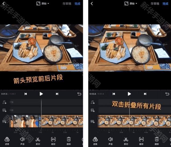 2、如果素材太多,双击片段就能迅速折叠素材,找到你想要编辑的片段,双击或双指展开就可以啦,是不是省了很多反复拖动素材的时间呢?