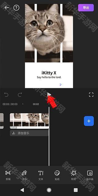 4、编辑界面的正下方,点击可查看“播放”效果,滑动下方的时间轴可查看视频帧;