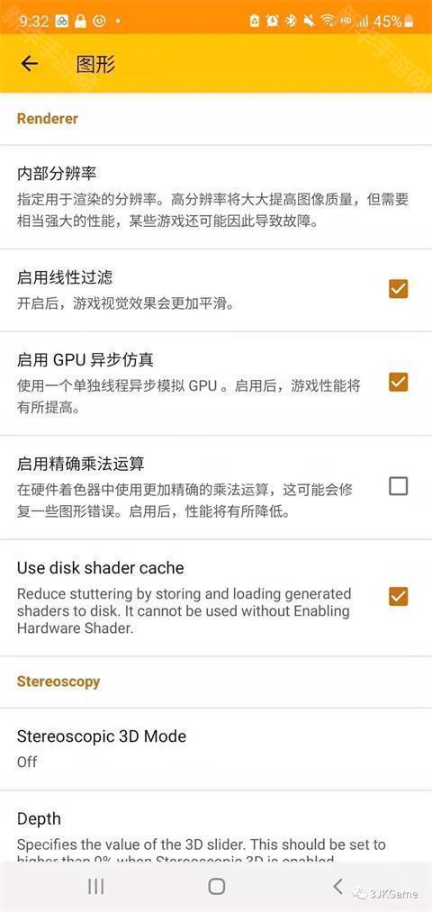 图形部分只有你觉得手机运行不畅的时候,再来调整,可根据需求打开或者取消下面功能以获取游戏流畅运行。下面的3D选项建议保持关闭,VR选项不要动它,除非你手机够好。