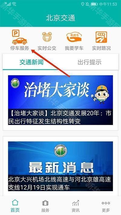 1、打开北京交通app,选择右上角“停车服务”图标,