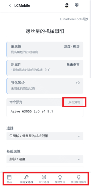 2.平台提供了多项功能,这里以【自定义遗器】为例,完成参数设置后得到“命运预览”,“点击复制”即可得到指令