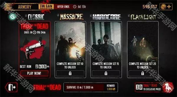 5、解锁游戏模式,游戏分为传统模式、大屠杀模式、极端模式和闪关灯模式;除传统模式外都需要完成任务来解锁。