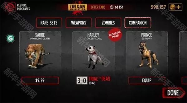 4、伙伴购买,这是一个比较有意思的系统;每隔一段时间会有一个你的宠物伙伴帮你干掉前面的僵尸,可以出现多个伙伴;包括有老虎、狼和狗等。