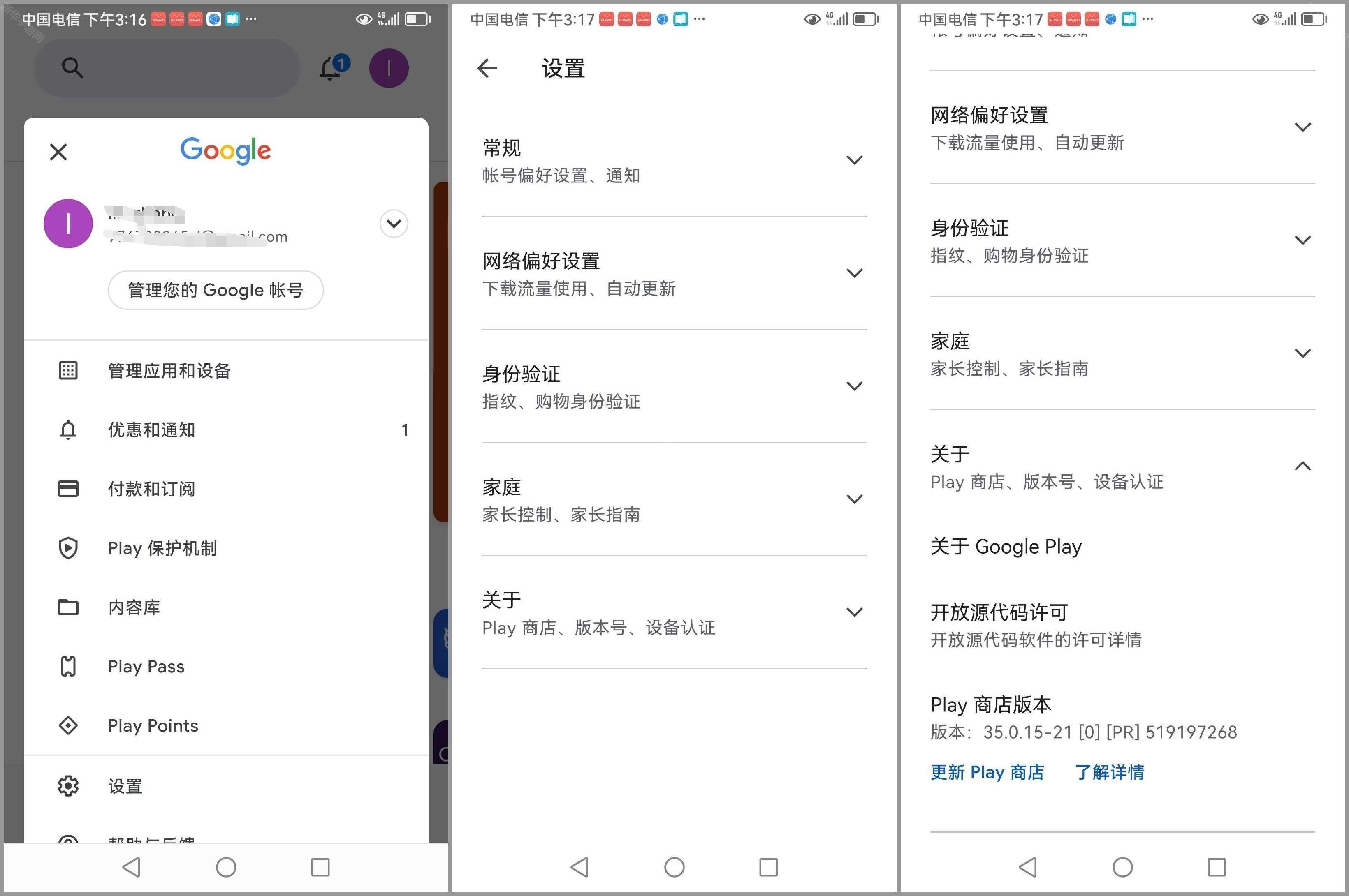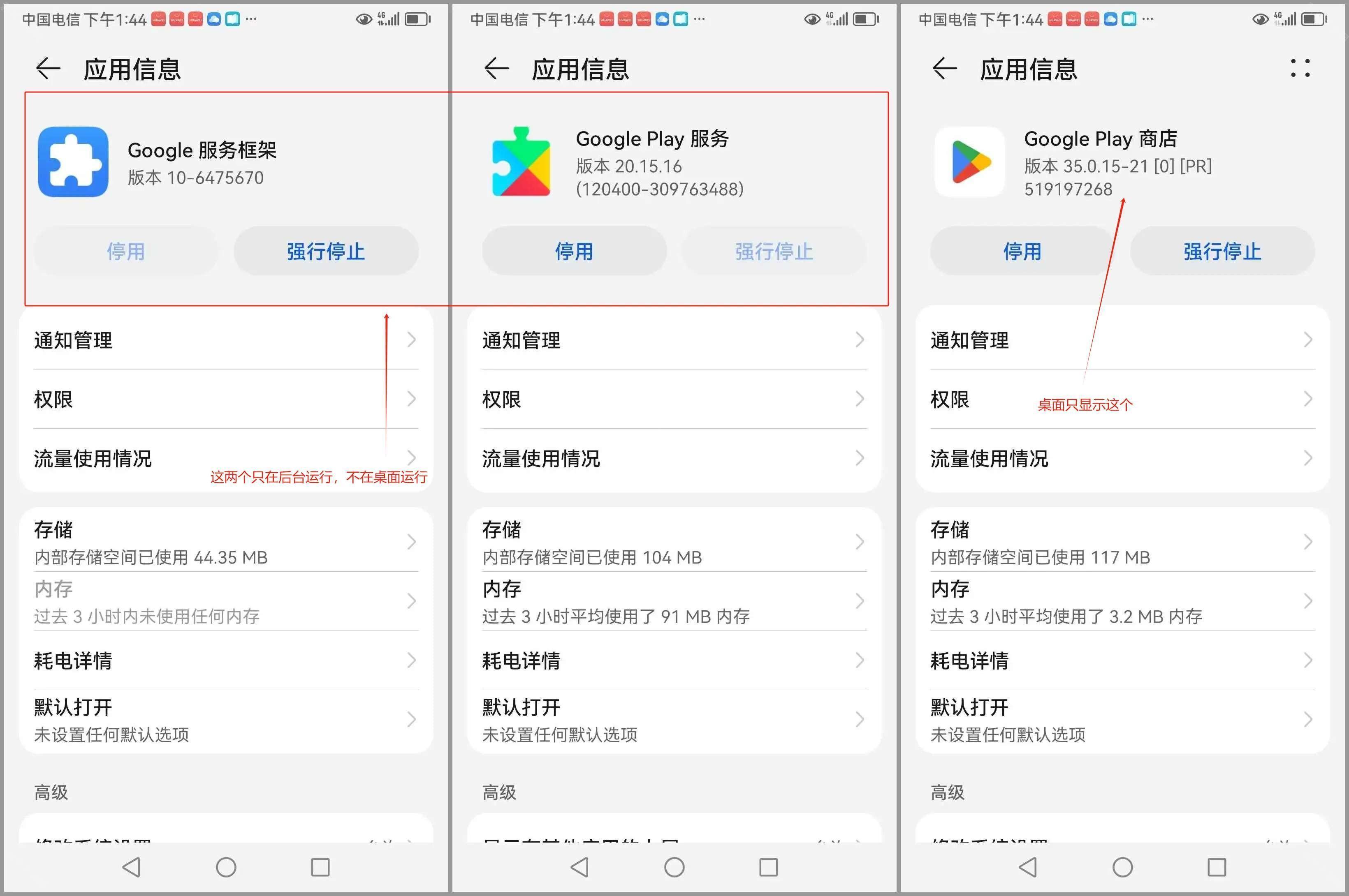 好多人安装三件套之后,就疑惑怎么只看到一个谷歌商店?那是因为Google 服务框架、Google Play服务只是在后台运行,只有商店在桌面显示