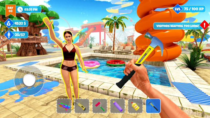 【水上乐园模拟器】这是一款模拟经营类型的游戏,游戏由“Go Dreams”工作室出品,玩家将在游戏中经营一家水上乐园,你将从一个一无所有的空地上建立一个小小的泳池,接收不同的客人们前来游玩,玩家可以不断的补充乐园的各种设施,比如滑滑梯、热狗摊、淋浴室等等,也要注意你的客人会再泳池里溺水,所以玩家需要在他们昏倒之前用游泳圈救援他们,快来试试看吧。