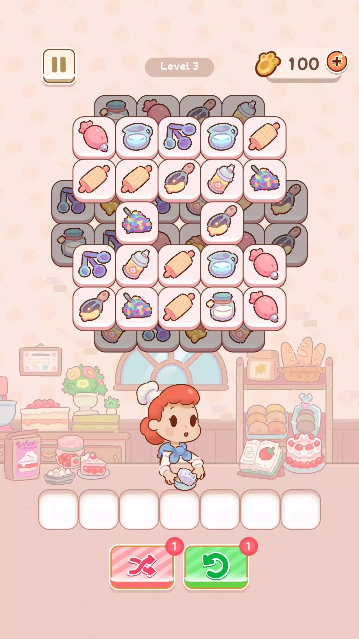 3.点击将配料堆叠到托盘上,可以合并和消除三个相同的配料。